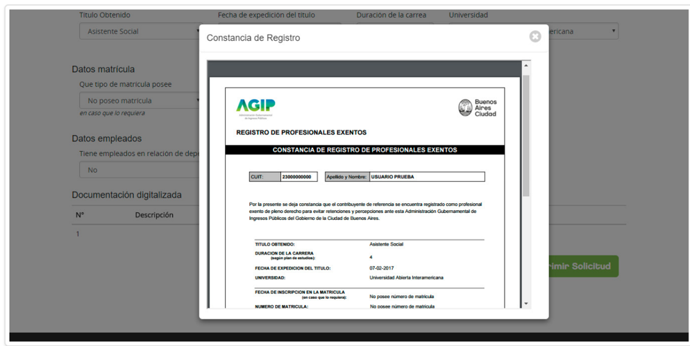 - Impresión de Constancia: Si tu solicitud fue exitosa y fuiste incluido en el Registro, deberás ingresar nuevamente al aplicativo de AGIP para imprimir la constancia que acredita tu exención.
