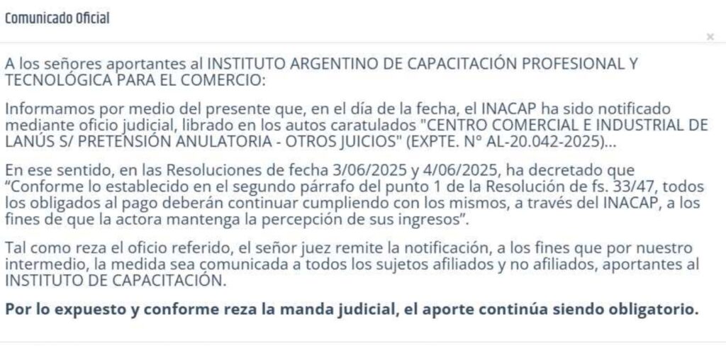 El Instituto Argentino de Capacitación Profesional y Tecnológica para el Comercio (INACAP) informa, a través de un comunicado en su página web, que la justicia dispuso que «todos los obligados al pago deberán continuar cumpliendo con los mismos, a los fines que la actora mantenga la percepción de sus ingresos”.
